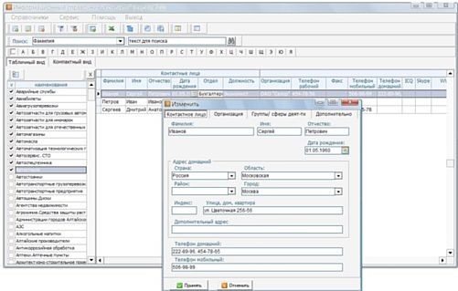 Адресно-телефонный справочник программа - предназначена для организации ввода, быстрого поиска и выборки различных справочных и контактных данных абонентов: группа, ФИО, дата рождения, телефоны личные и рабочие, адрес домашний и рабочий, сведения о работе, факс, email, icq, skype, сайт, дополнительные сведения.