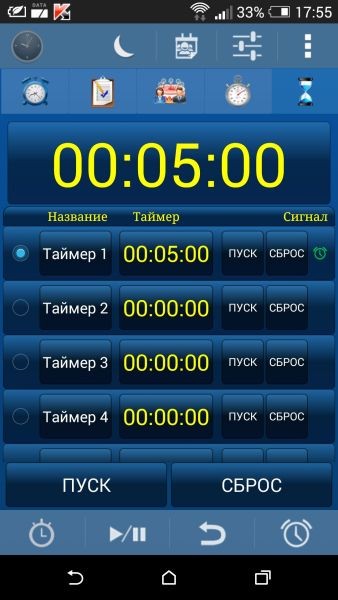 - Таймеры. Вы можете установить до пяти таймеров с разными параметрами для каждого таймера (набор рингтонов, вибрирующие, уведомления).