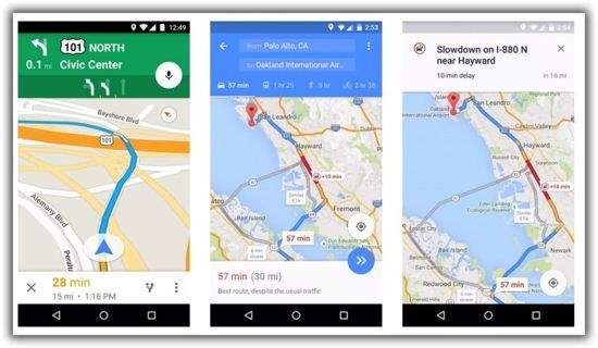 В приложении Google Карты имеется голосовая GPS-навигация для автомобилистов, пешеходов и велосипедистов, с подробной информацией о пробках и ДТП в режиме реального времени, а так же возможен автоматический подбор альтернативных маршрутов с учетом дорожной ситуации.