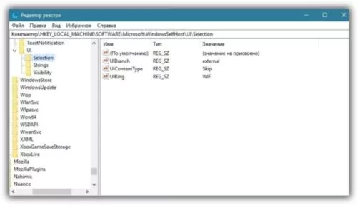1. В разделе HKEY_LOCAL_MACHINE/SOFTWARE/Microsoft/WindowsSelfHost/UI/Selection - изменить значение параметра UIContentType на Skip, а параметра UIRing на WIF.