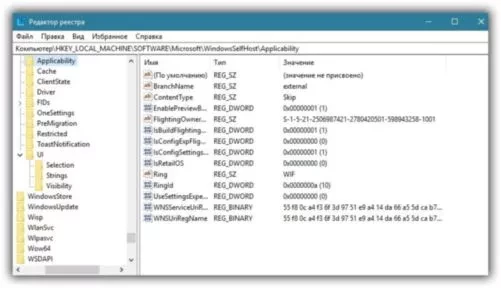 2. В разделе HKEY_LOCAL_MACHINE/SOFTWARE/Microsoft/WindowsSelfHost/Applicability - изменить значение параметра ContentType на Skip, а параметра Ring на WIF.