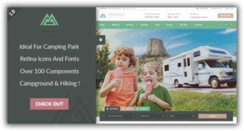 Шаблон Camping Village для многоцелевого веб-сайта. Внутри пакета есть файлы темы WordPress для всех страниц, оптимизированные для простой и быстрой настройки. Camping Village идеальная тема для многоместных кемпингов, палаток, караванов и бунгало.