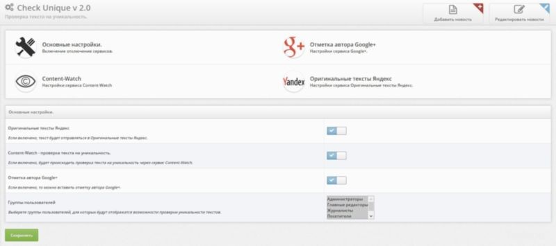 Check Unique модуль DLE проверка уникальности текста - при добавлении новости он проверяет текст на уникальность с помощью сервиса Content-Watch, после чего отправляет его в сервис оригинальные тексты Яндекс, а затем устанавливает по умолчанию тег Гугл.авторства.
