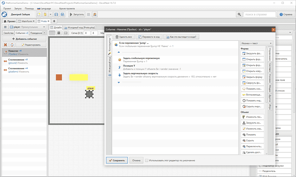 Для обучения и прототипирования в DevelNext есть множество различных мастеров и конструкторов. Есть конструктор событий, с помощью которого можно набросать логику, вместо того, чтобы вручную писать код.