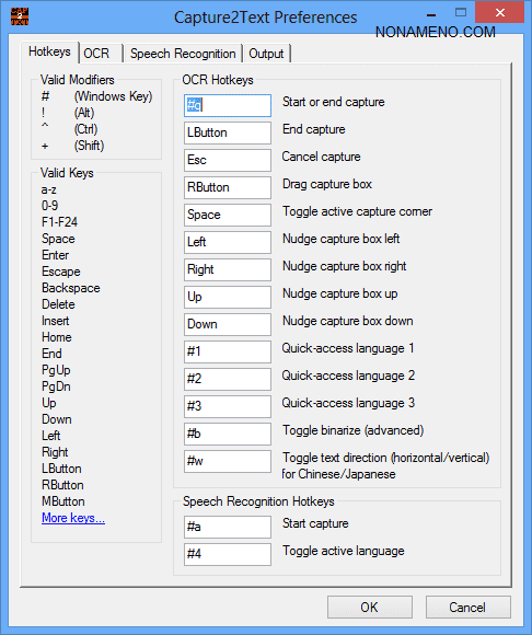 Захват разного пространства дисплея с текстом для последующего распознания осуществляется при помощи горячих клавиш, перечень коих сможете увидеть в соответствующей вкладке приложения. Аналогично учтена функция модифицирования горячих кнопок, что даёт возможность улучшить работоспособность.