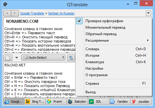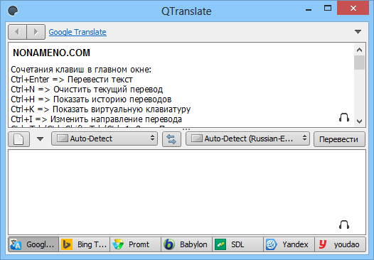 Работает она в онлайн-режиме и использует для перевода самые популярные службы, между которыми вы сможете переключаться. Поддерживает работу с Google Translate, переводчиком от Microsoft, есть служба Promt и Babylon, поддерживается сервис SDL, Yahoo! и конечно Яндекс перевод.