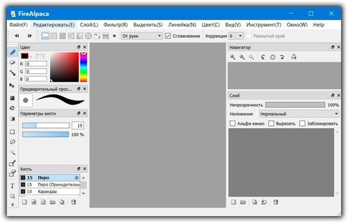 В центре можно рисовать и редактировать графику, слева панель инструментов, чуть выше навигация по основному меню: редактировать, слой, фильтры, выделить, линейка, цвета, вид, инструменты, окно, помощь. Вы сможете воспользоваться кистью, пером, есть ластик, так называемая волшебная палочка, лассо для удобного выделения предметов.