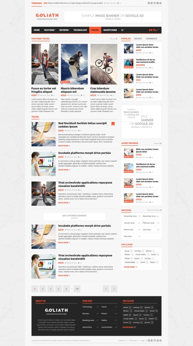 Goliath 1.0.23 адаптивный новостной шаблон wordpress - является в полной мере новости, обзорным и журнальной темой, которая прекрасно выглядит и работает на мобильных устройствах, планшетов и компьютерах.