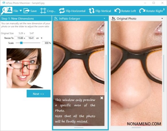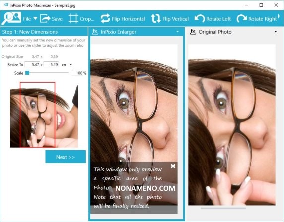 После завершения старта программы InPixio Photo Maximizer необходимо просто-напросто подобрать подходящую графическую картинку, дальше по левую сторону на маленькой картине выбрать "часть", которую надлежит увеличить, потом обозначить масштабность в %, и следом с правой стороны увидим оригинал фотографии и то, что выйдет после завершения обработки.