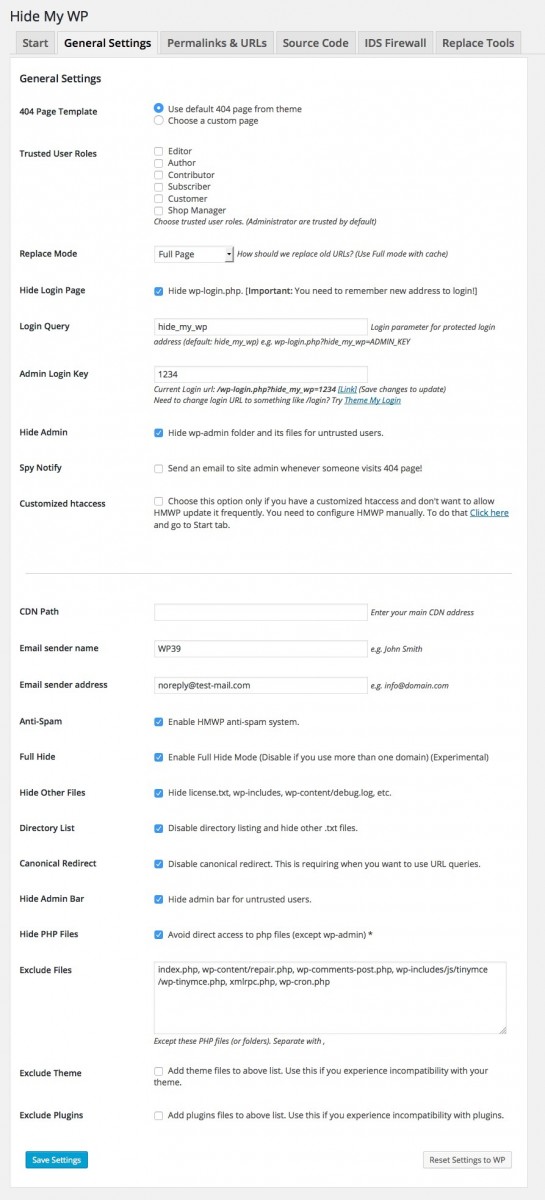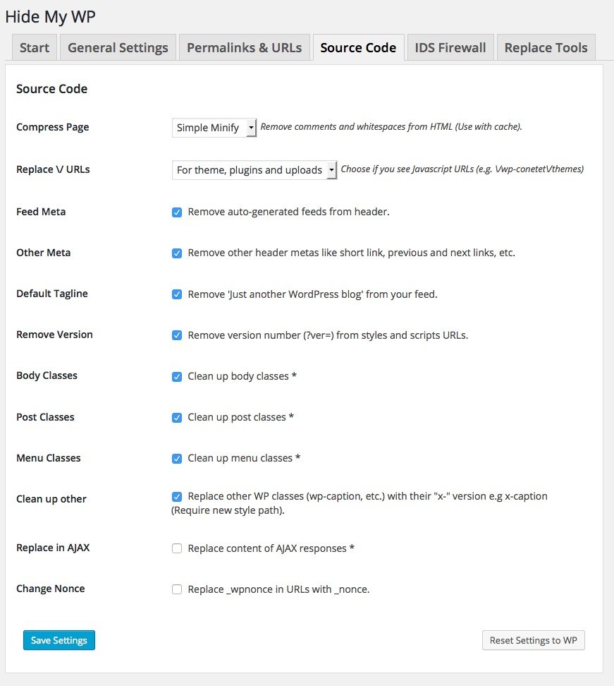 Hide My WP удалит мета-данные WordPress, поменяет постоянные ссылки, удалит и подчистит ненужные классы в CSS-стилях.