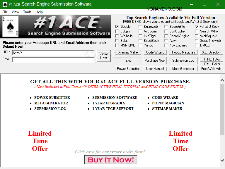 #1 ACE Search Engine Submission Software программа для разработчиков веб-сайтов - приложение которое намеренно создана в интересах создателей интернет-сайтов, дающая для них способность с лёгкостью отсылать URL-адреса и адреса email почты в поисковые системы ПС.