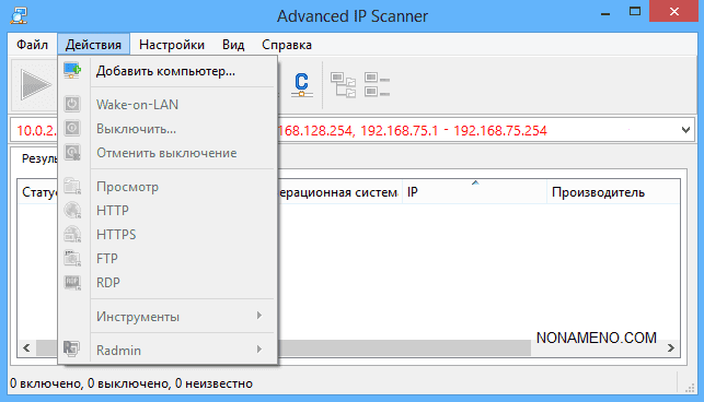Advanced IP Scanner обладает приятным интерфейсом, есть Русский язык, сориентироваться не сложно после. Все производимые вами лично действия возможно применять разом для нескольких персональных компьютеров, возможно записывать и закачивать перечень сканирования.