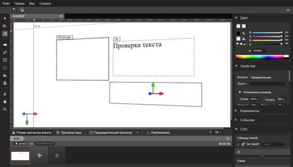 В нем поддерживается работа как с кодом страницы, так и в представлении ее визуального дизайна, в браузере в вашей ОС, выбранном по умолчанию. В режиме макета можно использовать инструменты для рисования, добавлять текст и трехмерные объекты, а также анимировать элементы с помощью временной шкалы.