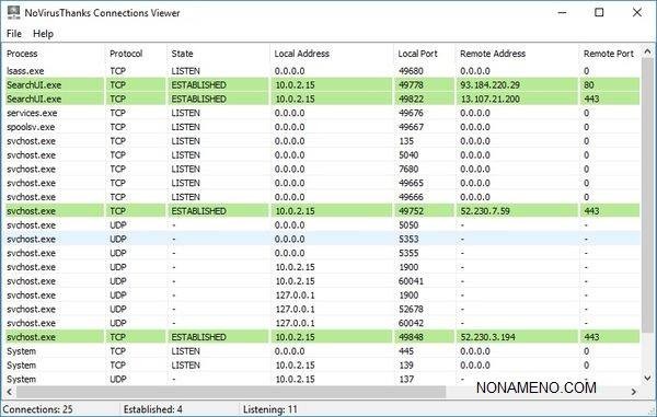 NoVirusThanks Connections Viewer сетевая программа - это маленькая сетевая программа, она станет показывать протекающие соединения. Оформление интерфейса для комфорта поделен на несколько колонок, в определенной из них отражается точные сведения.