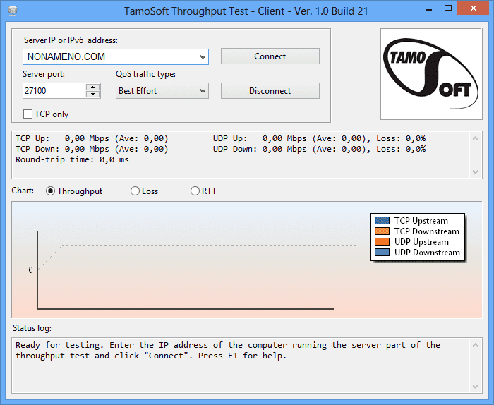 Программа Throughput Test после запуска способна посылать UDP и TCP потоки по вашей сети, после будет отображена текущая скорость передачи данных.