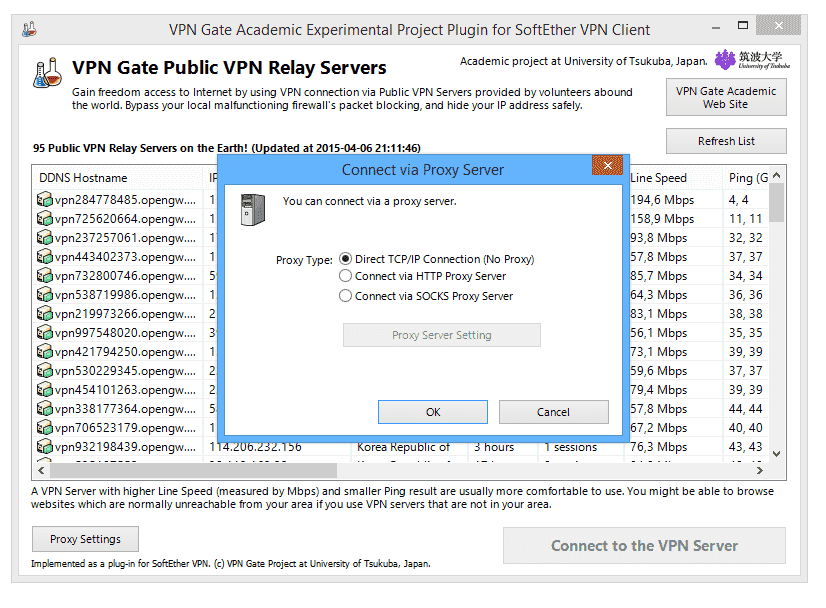 Рекомендуется выбирать VPN сервер, который находится ближе к вашему месторасположению ( не думаю, что у вас это получится ). Далее подключаемся к нужному серверу и радуемся, теперь можете смело посещать запрещенные веб-сайты. Большинство серверов в VPN Gate Client Plug-in находятся в Корее и Японии, немногие в США и Европе.