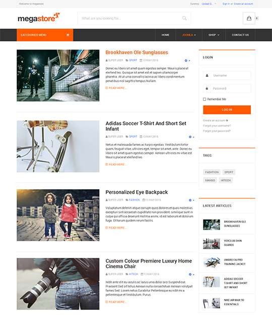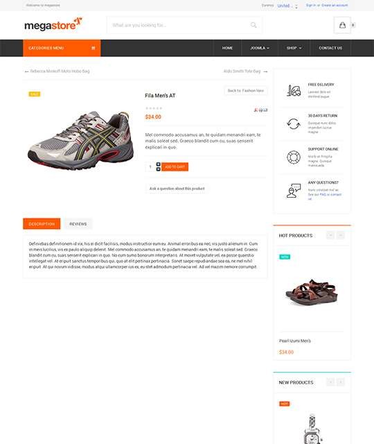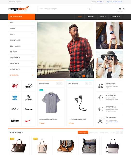 JA Megastore адаптивный шаблон интернет-магазина Joomla - для магазинов, бутиков предметов одежды и аксессуаров, однако шаблон полноценно сможет применяться в любой подобной направленности электронной торговли.