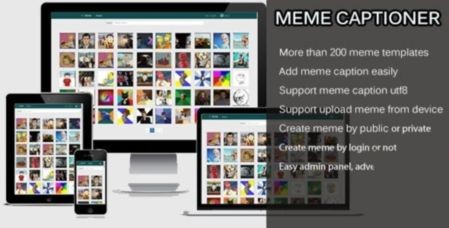 Meme Captioner скрипт сайта мемов - пользователь может легко создать особый мем из сотни существующий шаблонов мема (загруженные пользователями или администратором) для того, чтобы затем поделиться этим в социальных сетях, таких как Facebook, Twitter, Pinterest, Reddit и т.д.