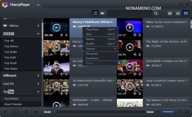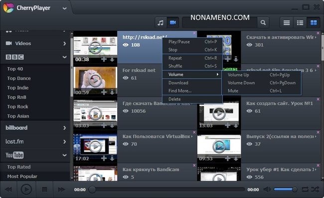Программа CherryPlayer предоставляет вам доступ на онлайн-сервисы как: YouTube, BBC, Bilboard и Last.fm, вы имеете возможность подбирать подходящие для вас категории видеоклипов и композиций, использовать поиск, смотреть наиболее популярные закачки, имеется в том числе и TOP-100 и список наилучших произведений, следовательно в случае, если вы не очень хорошо знаете, что сегодня смотреть либо прослушать, в любой момент сможете в нужный раздел и осмотреть все наиболее увлекательное и новое.