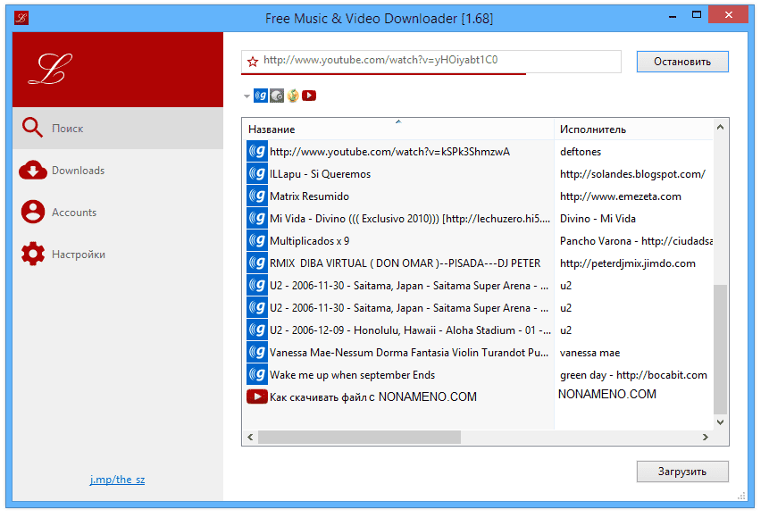 Free Music & Video Downloader программа загрузки музыки и видео - скачивает с разных специализированных сайтов, например: last.fm, vkontakte, goear, youtube, vimeo, SoundCloud, mixcloud, BandCamp, kinox, ardmediathek, Xiami, Music.Baidu, Hulkshare, MP3Fusion, MP3Skull, SkyRock, 8Tracks и других, список есть официальном сайте.