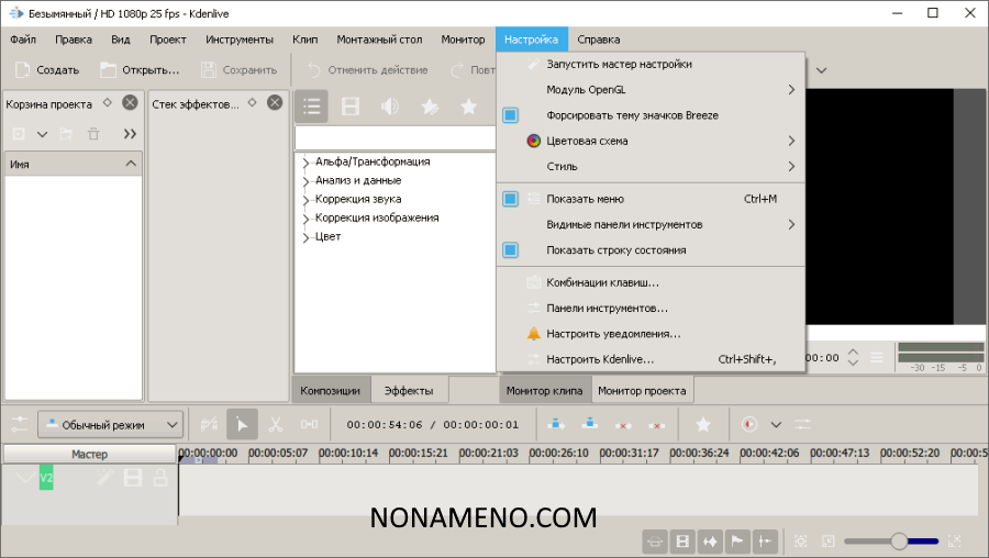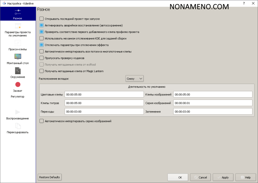 Программа Kdenlive помогает регулировать безграничный диапазон параметров. Следовательно, вы сможете подобрать пользовательскую рабочую папку проекта, ставить нужные разрешения и частоту кадров, поставить размер кадра и пропорцию отображения, подключить миниатюры видеороликов либо аудио, изменять метаданные, просмотреть перечень файлов проекта и иметь доступ к кэшированной информации.