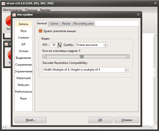 Следует заметить, что приложение способно писать и звук во время записи видеофайлов, указатель сможете отключить, чтобы не видно было на изображении и видеоролике. Программа oCam Screen Recorder при выполнении записи рабочего стола даст возможность подобрать кодеки те, что присутствуют в операционной системе, дополнительно вы можете произвести настройки качество звучания.