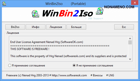 Программа WinBin2Iso не просит инсталляции и сможет запускаться с носителя информации не оставив следов в системном реестре. Русский язык есть, приложение целиком и полностью бесплатно.