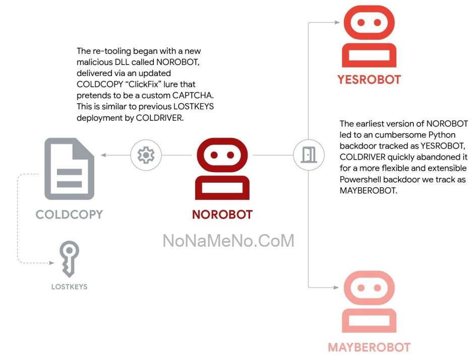 Хитроумная схема инфицирования начинается с HTML-документов типа ClickFix («COLDCOPY»), содержащих ловушку, предназначенную для установки библиотек DLL (NOROBOT). Далее через утилиту rundll32.exe загружается следующий уровень инфекции. Ранние образцы кампании доставляли троян на основе Python под названием YESROBOT, позже замененный на модуль MAYBEROBOT, написанный на PowerShell.