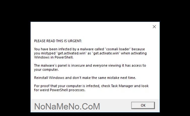 - Ваше устройство было заражено вирусом «Cosmali Loader» вследствие неверного ввода домена при попытке активации Windows через PowerShell.