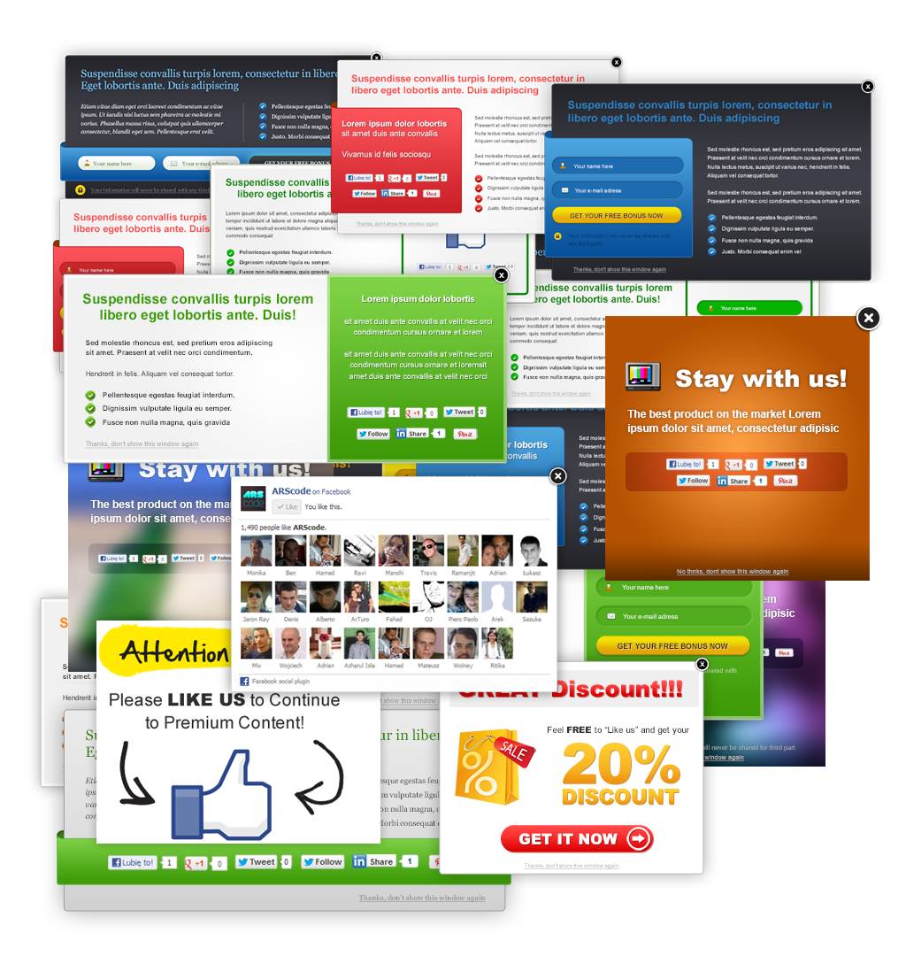Это может быть предложение подписаться на рассылку, отметится в фейсбуке или вывести кнопки социальных сетей. Может просто выводить окна с любыми вашими картинками и информацией.