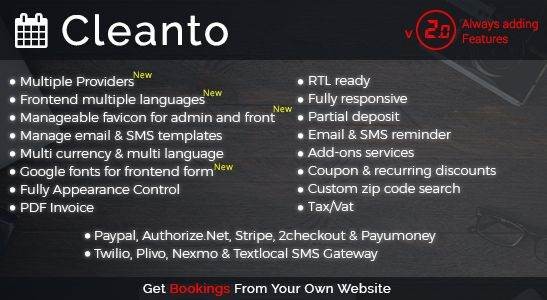 Скрип тCleanto можно использовать несколькими способами, вы можете создавать свои собственные методы расчета цен, у него есть интересные функции, такие как динамическое ценообразование, дополнительные услуги, резервирование одной страницы, контроль над внешним видом, удобная настройка расписания, гостевая проверка пользователя, частичный депозит, экспорт в csv, скидки и многое другое.