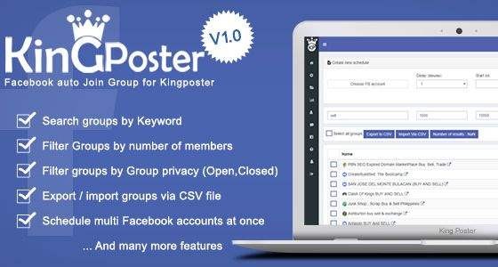 Facebook Auto join groups скрипт модуль для Kingposter - прекрасный модуль позволяет вам искать по ключевому слову и автоматически присоединяться к группам, используя несколько учетных записей Facebook.
