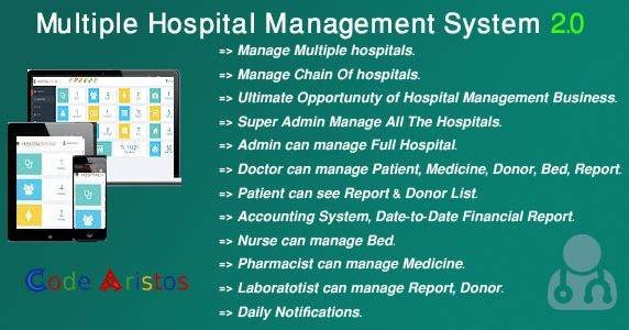 Multi Hospital управление больницей - прекрасный скрипт для управления клиникой основан на PHP с Codeigniter Framework. Вполне удобная для пользователей система с адаптивным дизайном и чистым кодом.