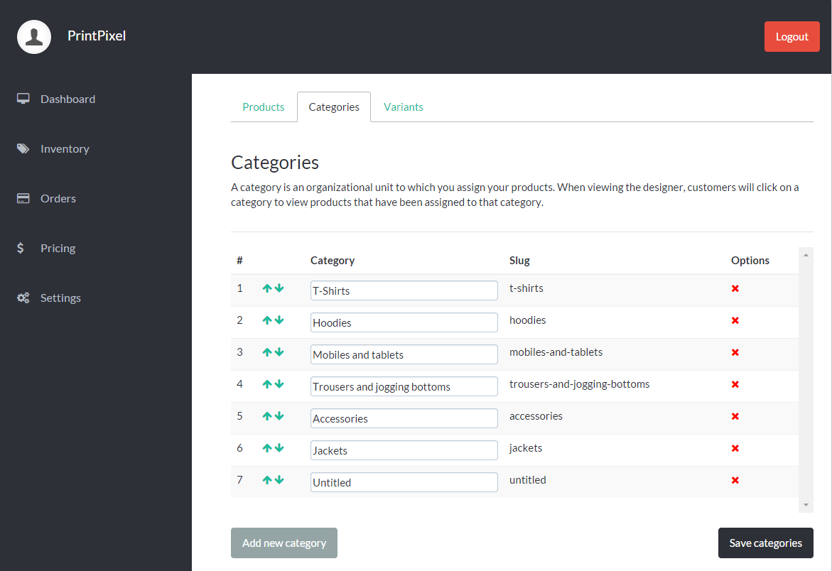 - Интерфейс Admin, чтобы добавить продукты, окрасьте варианты и управлять заказами