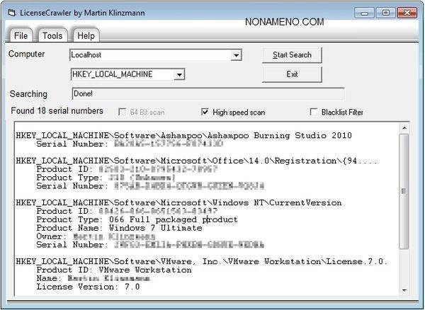 LicenseCrawler поиск лицензий от программ - в случае, если вы желаете вновь произвести настройки своего компьютера, вам нужно иметь в наличии лицензии и серийные номера для всех программ те, что вы купили и зарегистрировали. Это охватывает ключ самой Windows, а точно также иные серийные номера для таких приложений, как, например Nero, Office, VMWare и практически всех остальных приложений.