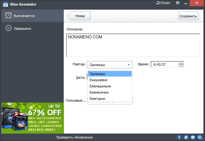 Ввиду того, что программа Wise Reminder имеет Русский язык, управлять программой будет еще комфортнее, от клиента после пуска нужно попросту сделать новенькую заметку, подобрать в какое время вам напомнить о событии, определить число повторов и установить промежуток, потом относительно ее работы следует попросту позабыть, приложение непременно всем вам напомнит и в добавок проиграет звуковой файл который вы определите.
