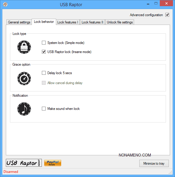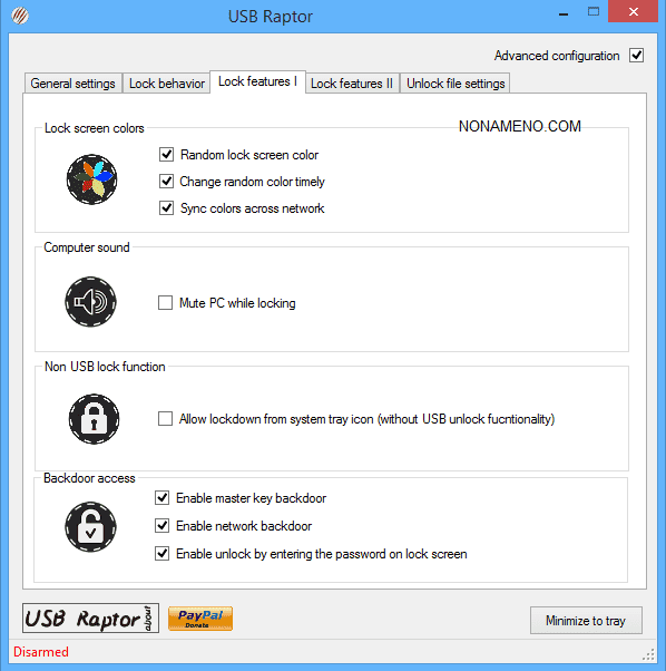 Два режима блокировки, первый это просто "Блокировка системы", а второй "USB Raptor блокировка". Можно настроить программу так, что бы она использовала разные цвета экрана блокировки и через нужное время изменяла их, можно выключить звук ПК и так далее.