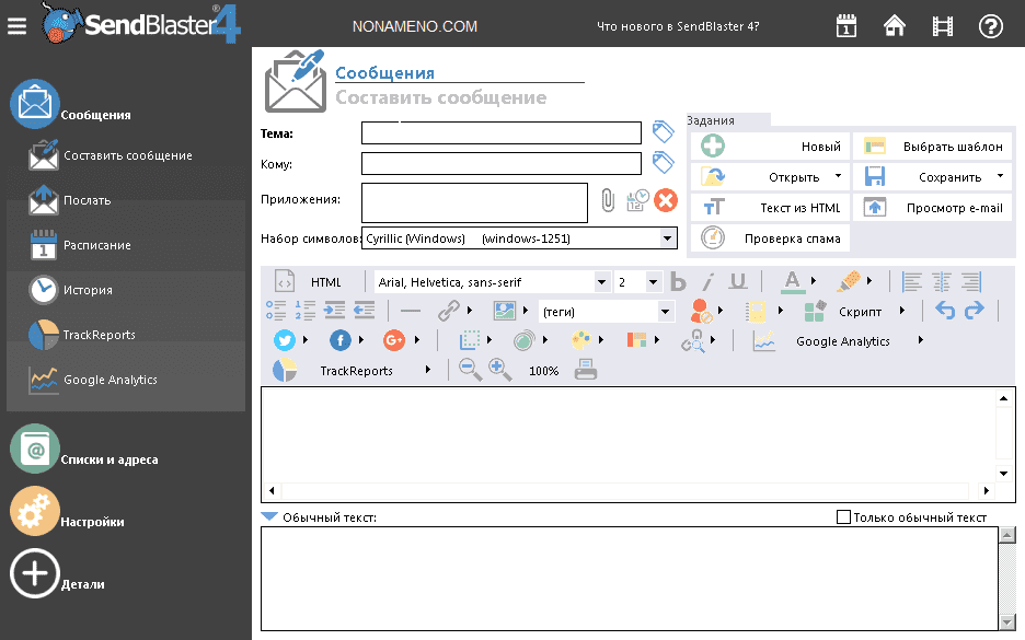 Для написания содержания грядущей рассылки применяется интегрированный визуальный редактор со типичным ассортиментом инструментариев и импорт HTML файлов, добавлять рисунки и вложенные файлы. Когда основных возможностей редактора станет недостаточным, в любой момент возможно включить внешний редактор.
