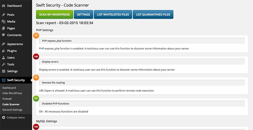 - Сканер кодов, чтобы найти уязвимости в ваших плагинах и в вашей системе. Эта функция поставляется с возможностью запланировать сканирование для различных временных интервалов.