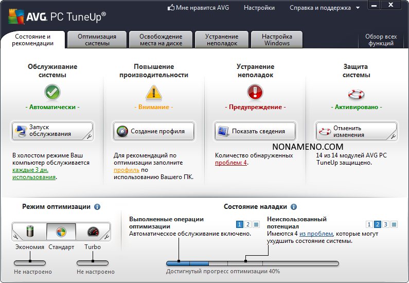 Одновременно нужно заметить довольно комфортный интерфейс программы AVG PC Tuneup Pro, Русский язык имеется, все инструменты поделены на группы, ими удобно пользоваться, по окончании 1-ого старта сможете просмотреть общее статус ПК, а после принимать решение, следует оптимизировать систему либо ненужно.