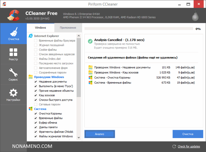 Программа CCleaner аналогично чистит кратковременные данные и перечни недавно открытых файлов прочих приложений, к примеру: Media Player, Safari, eMule, Kazaa, Google Toolbar, Netscape, MS Office, Nero, Adobe Acrobat, WinRAR, WinAce, WinZip и другие..