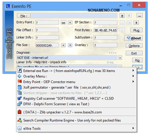Exeinfo PE просмотр детальной информации о файле - совершенно бесплатная и переносная программа, каковая даст возможность просмотреть весьма детализированные данные о необходимом для вас фале. Она сможет напомнить чем был запакован либо защищен, а также дополнительно чем скомпилирован исполняемый файл.
