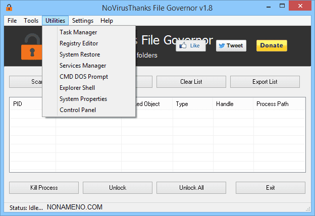 На вкладке Утилиты, есть доступ к диспетчеру задач, редактору реестра и прочим (от Unlocker отличается отсутствием драйвера, все действия производит через системные функции).