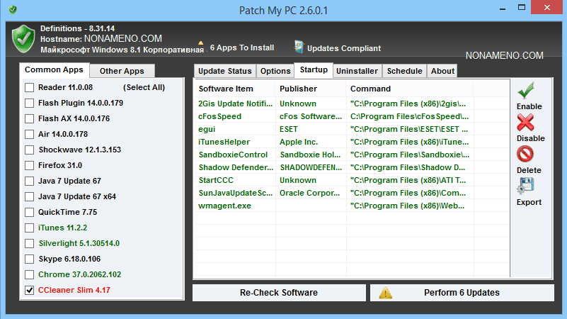Patch My PC полностью портативна и может запускаться откуда угодно. В главном окне можно просмотреть, ваши программы в системе и рядом информацию о том, есть новая версия или нет. Также программа предложит вам быстрый доступ к наиболее часто запускаемым программам.