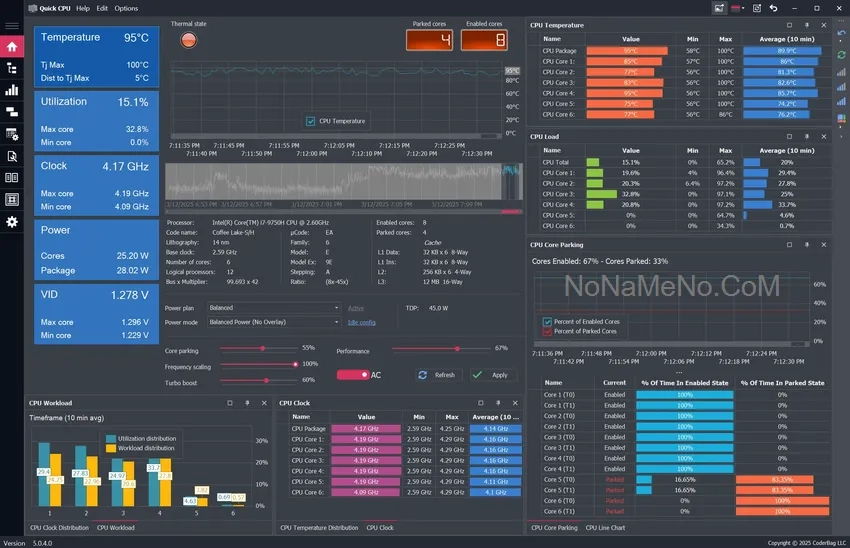 Детальный мониторинг ядер: В интерфейсе программы отображается график производительности для каждого физического и логического ядра процессора в реальном времени. Пользователь наглядно видит, какие ядра активны, а какие находятся в состоянии парковки (припаркованы), что помогает выявить узкие места в производительности системы.