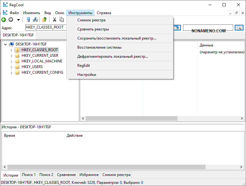 Вы точно также всегда сможете применять кнопочки "Отменить" и "Повторить", имеется функция настройки разрешения, отсмотреть характеристики ключа, увидеть хронологию, сделать перечень избранного и осуществить поиск по подобранному ключику либо целому реестру. Помимо этого, RegCool даст возможность сделать запасные копии и восстанавливать реестр, сопоставлять реестры и копии, иметь доступ к редактированию реестра, импорт избранного RegEdit (это стандартная программа для реестра ОС Windows) и отлаживать основные функции.