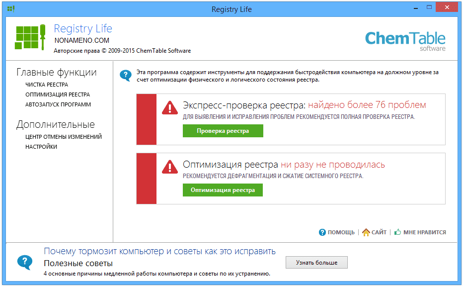 Программа Registry Life проверяет реестр по 10 разным критериям, интерфейс простой и удобный.