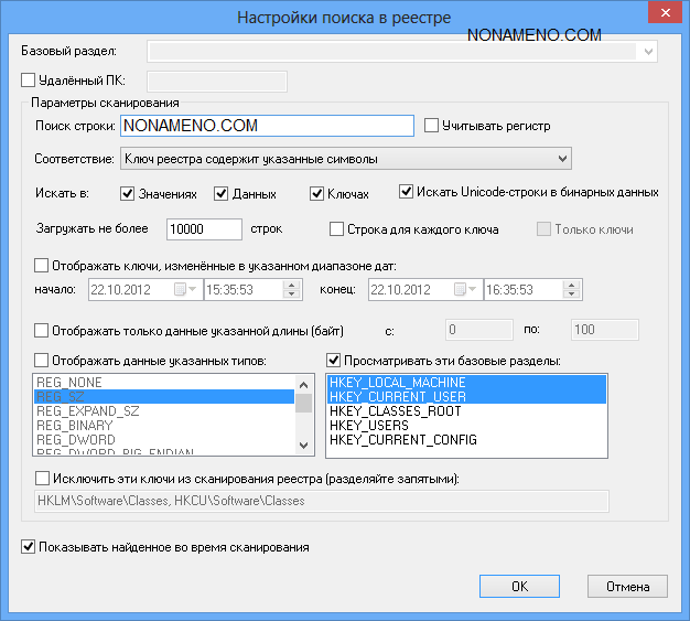 RegScanner поиск в системном реестре - еще одна необходимая обслуживающая программа от Nir Sofer (неизменно портативная), она после завершения запуска может в строгом соответствии с вашими аспектами, выполнить сверхбыстрый поиск в системном реестре, после завершения покажет все найденные данные в комфортном для вас облике.
