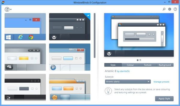 Stardock Windowblinds настройка графического интерфейса Windows - очень комфортная в использовании компьютерная программа для отладки графического интерфейса ОС Виндовс, скачать программу Stardock Windowblinds всегда сможете внизу страницы. После завершения старта приложения вы имеете возможность поменять внешность окошек и кнопочек, сменить иконки и все прочие графические компоненты.
