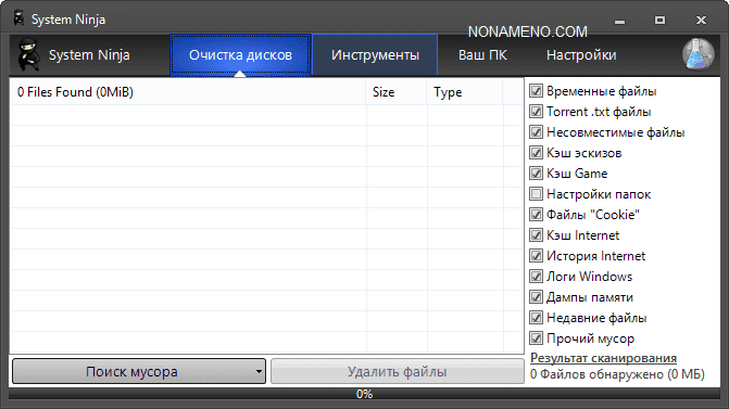 Программа System Ninja по завершении старта уберет весь мусор из системы. Различие от схожих приложений у этого продукта существует, к примеру создатель приложения удостоверяет, что CCleaner находит мусор только там, где вы реально показали, в то время как способ сканирования программы System Ninja функционирует по иной технологии, системный мусор будет найдет в какой угодно области, где бы он не располагался, будет выполнен полный анализ файловой системы.
